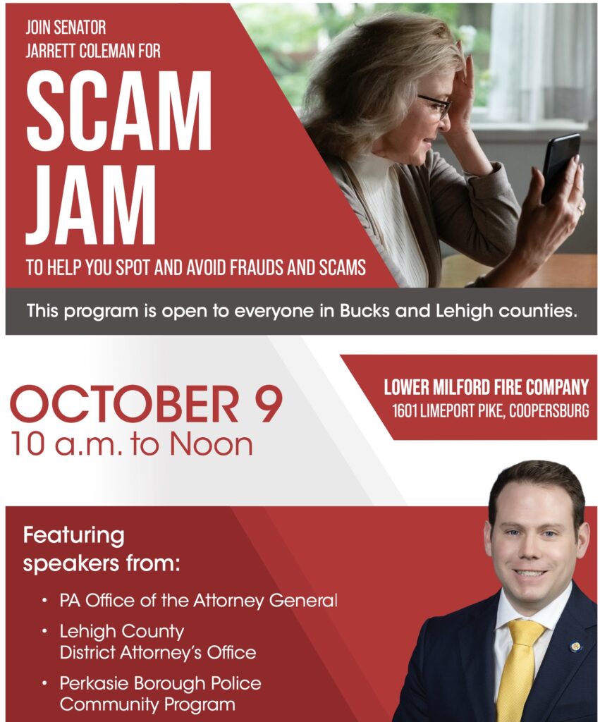 State Senator Jarrett Coleman’s office is hosting a Scam Jam on October 9th from 10:00 to noon at the Lower Milford Fire Company. The program is open to everyone in Bucks and Lehigh counties and will feature speakers from the Pennsylvania Attorney General’s Office, Perkasie Borough Police, Lehigh County District Attorney’s Office, and AARP.