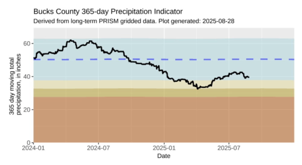 Precipitation: Over the past 90 days, 12.6 inches of rain fell over Bucks County, which is within the normal range. Over the past 365 days, 39.6 inches of precipitation fell, which is just within the normal range (the average is 50.1 inches).